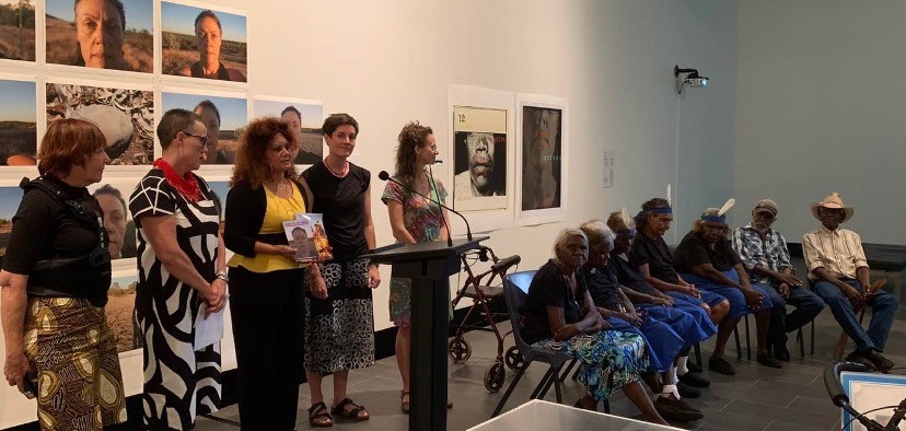 ‘Songs from the Stations’ which was launched by Senator Malarndirri McCarthy in November 2018 and aired on NITV the same month (l-r Penny Smith, Brenda L Croft, Sen. McCarthy, Felicity Meakins, Myf Turpin, and Gurindji singers